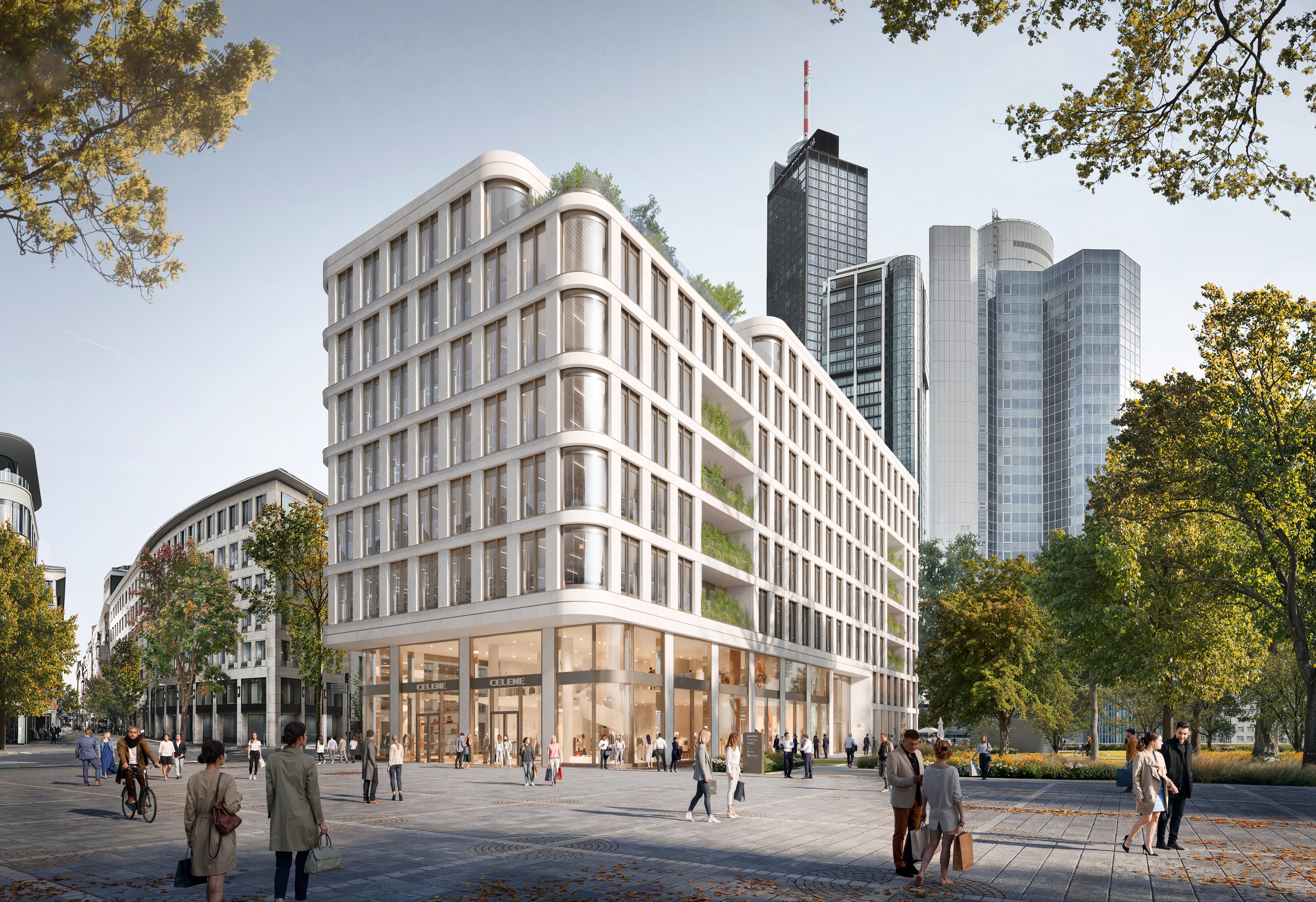 Mit Opernplatz 2 entsteht in unmittelbarer Nähe zur Alten Oper eine hochwertige Büro- und Geschäftsimmobilie, die eine zentrale Baulücke am westlichen Eingang zur Frankfurter Innenstadt schließt. Die architektonische Konzeption verbindet städtebauliche Prägnanz mit einer klar strukturierten Gebäudehülle. Die Fassade aus hellem Naturstein erhebt sich ab dem zweiten Obergeschoss über einem transparenten, zweigeschossigen Sockel und prägt das Erscheinungsbild des Gebäudes am Opernplatz. Großzügige Eckverglasungen greifen die stadträumliche Geometrie auf, während gezielte Einschnitte in den oberen Geschossen Dachterrassen ausbilden und die Fassadenstruktur differenzieren.